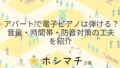 賃貸の話アパートで電子ピアノは弾ける? 音量・時間帯・防音対策の工夫を紹介 アパートでの電子ピアノ演奏は、様々な工夫を凝らすことで楽しむことができます。音量や時間帯の配慮、防音対策を行うことで、隣人への影響を最小限に抑えつつ、自宅で音楽を楽しむことが可能です。本記事では、アパートで電子ピアノを弾く際に役立つ情報や対... 2025.11.09賃貸の話