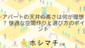 賃貸の話アパートの天井の高さは何が理想? 快適な空間作りと選び方のポイント アパートを選ぶ際に、気になる要素の一つに天井の高さがあります。天井が低すぎると圧迫感があり、反対に高すぎれば光熱費がかさむことも。どのような高さが理想的なのか、快適な空間を作るためのポイントを解説します。天井の高さは居住空間の印象を大きく左... 2026.01.12賃貸の話