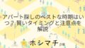 賃貸の話アパート探しのベストな時期はいつ? 賢いタイミングと注意点を解説 アパート探しを始めようと思うと、最適な時期はいつなのかと疑問に感じることがあります。これは新生活の準備をする上で、重要な要素となります。ここでは、アパート探しにおける賢いタイミングと注意点について詳しく解説します。最適な時期を知ることで、多... 2026.01.12賃貸の話
