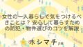 古い設計のマンションや設備が脆弱な物件は注意が必要です。特に玄関や窓の鍵が古く、簡単に開けられる場合は、侵入のリスクが高まります。最新の防犯設備が設置されているか確認しましょう。